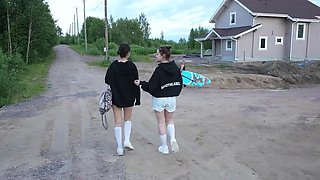 Two Teens Strip Naked at Lake and Get Fucked by Surfer in Outdoor Threesome
