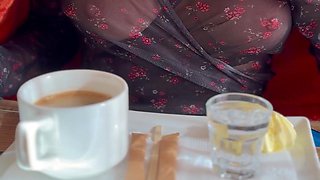 This trashy shameless woman wants to give her lover a handjob in public